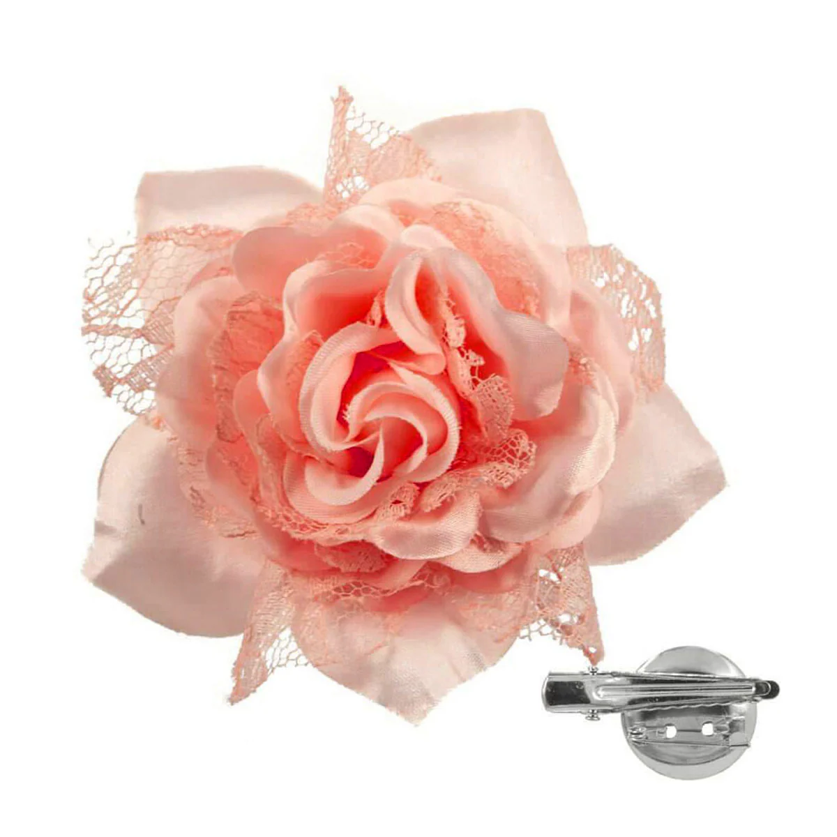 Kukalla tuot reilusti väriä kampaukseen tai vaatteeseen. Satiinisen kankaan lisäksi pitsi tekee kukasta eloisan ja kauniin. Helppo ja nopea kiinnitys.