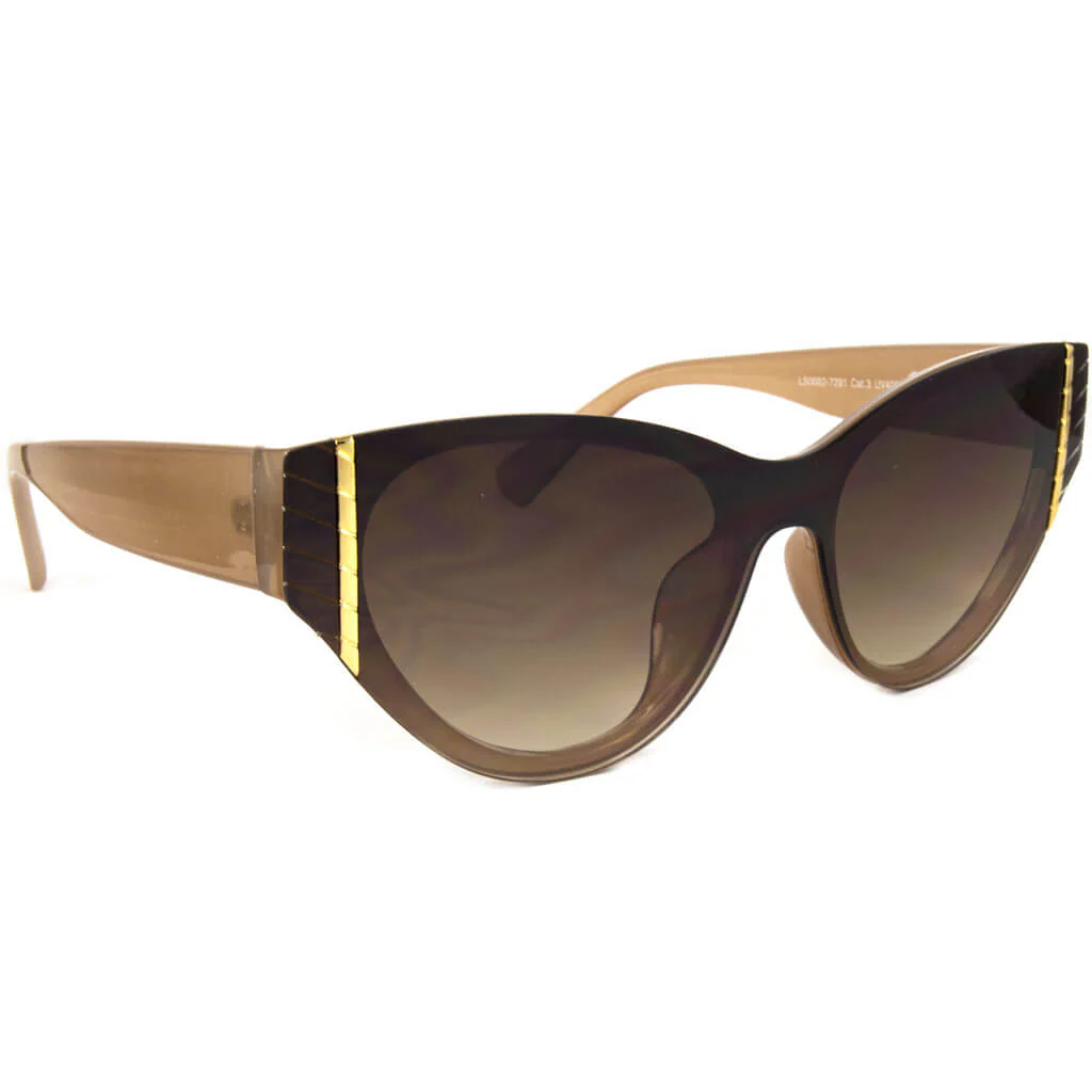 Kissamaisen naisellinen aurinkolasi on mahtava valinta aurinkoiseen päivään. Mallin etumus on kokonaan tasainen yhdestä linssistä tehty. Linssin laidoissa on kultaiset koristeet.